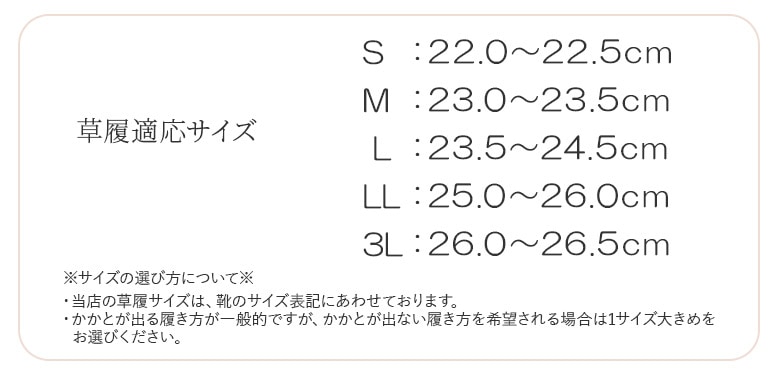 ※サイズの選び方について※ ・当店の草履サイズは、靴のサイズ表記にあわせております。 ・かかとが出る履き方が一般的ですが、かかとが出ない履き方を希望される場合は1サイズ大きめをお選びください。 ・新品の草履は鼻緒がかたいため、草履が小さい・窮屈だと感じる場合がございますが、着用前に鼻緒を伸ばしたり、ほぐしたりしていただくと、履きやすくなります。