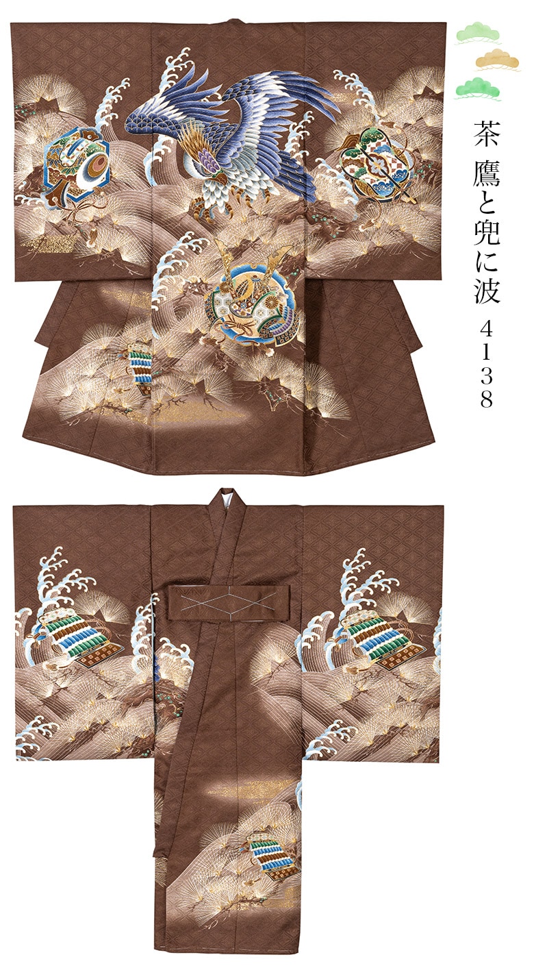 お宮参り 初着 男の子 産着 着物 お祝い着 赤ちゃん ポリエステル 5柄 水色 薄紫 ピンク 黒 兜 松の葉 鷹 梅 小槌 白波 軍配 化粧箱入り 男児 販売