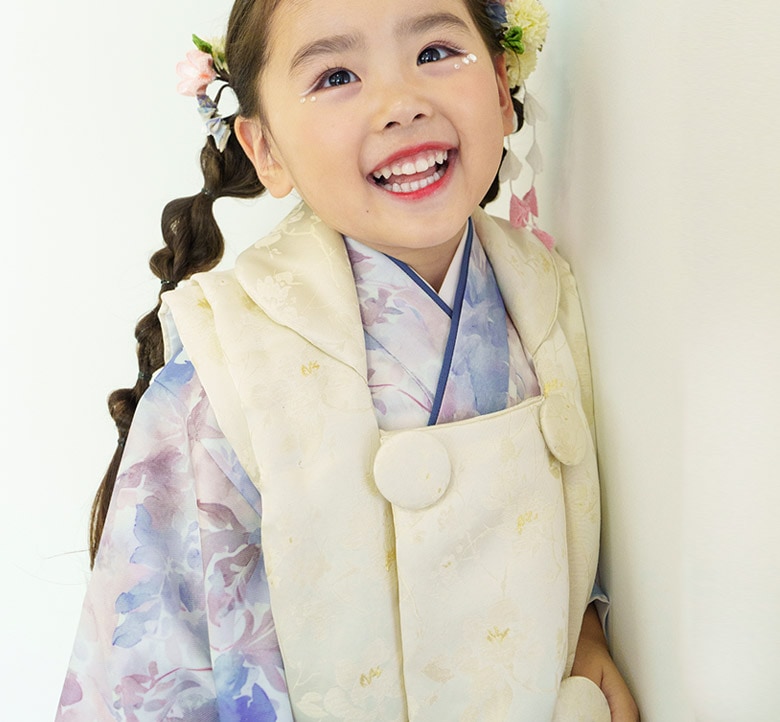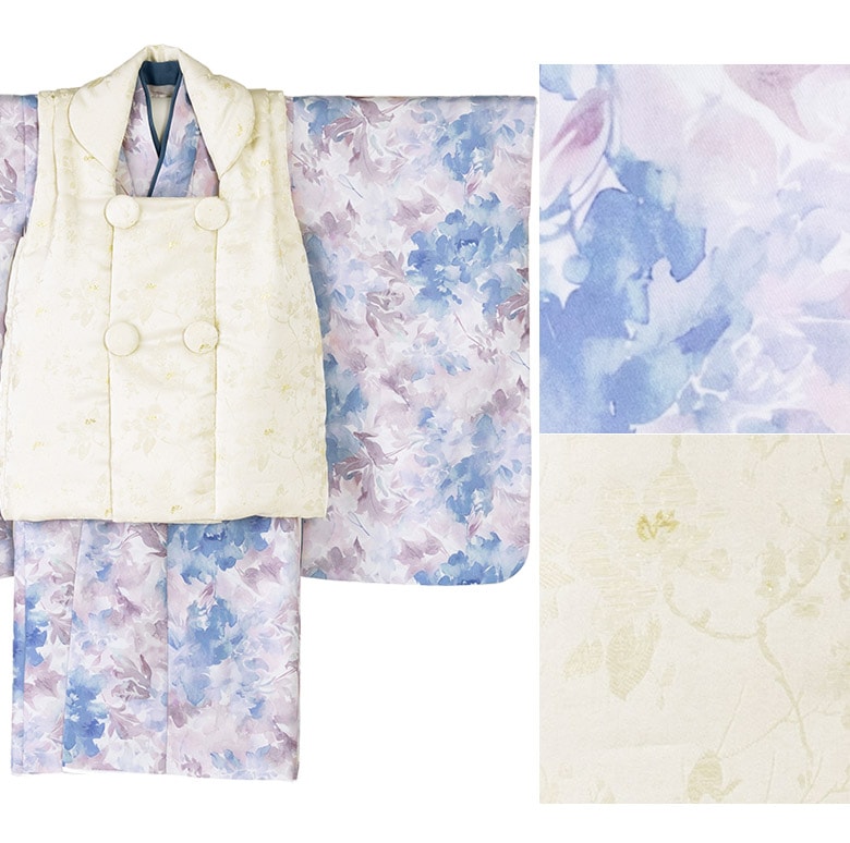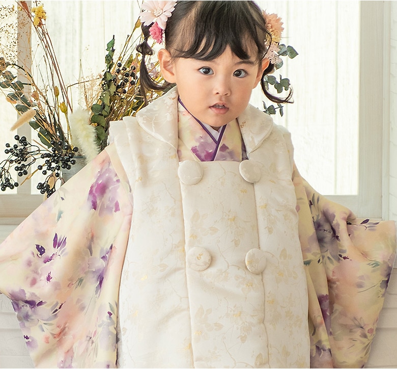 着物(重ね衿付)・襦袢(白半衿付)・被布コート・足袋(14-17cm対応)・腰紐(1本) |