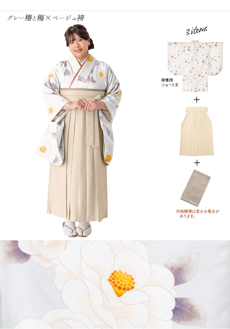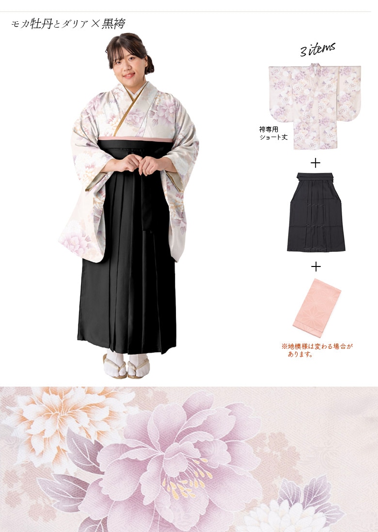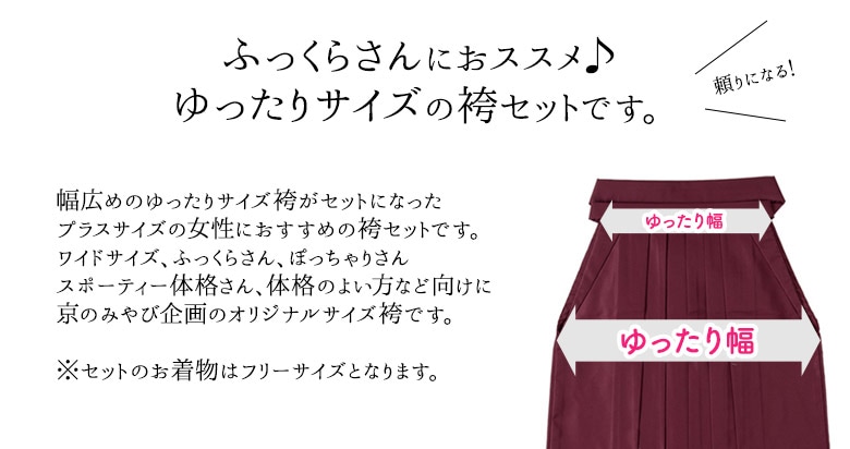 幅広めのゆったりサイズ袴がセットになったプラスサイズの女性におすすめの袴セット。