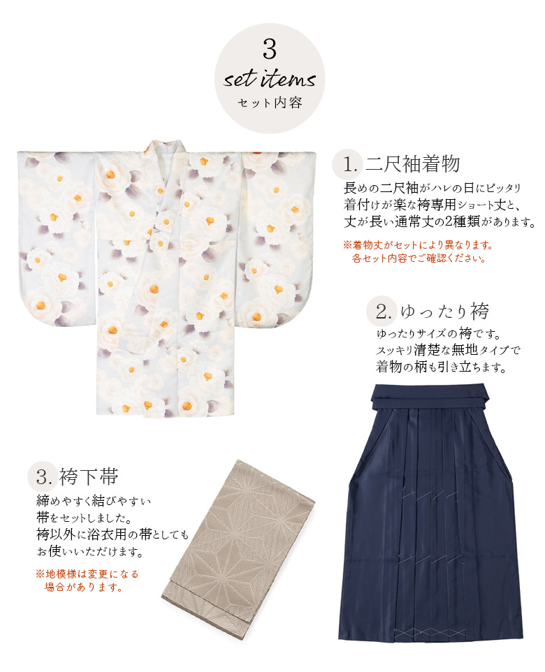 ・セットに含まれる袴は価格を抑えるために本格的な誂え仕立て袴とは一部縫製が異なります。