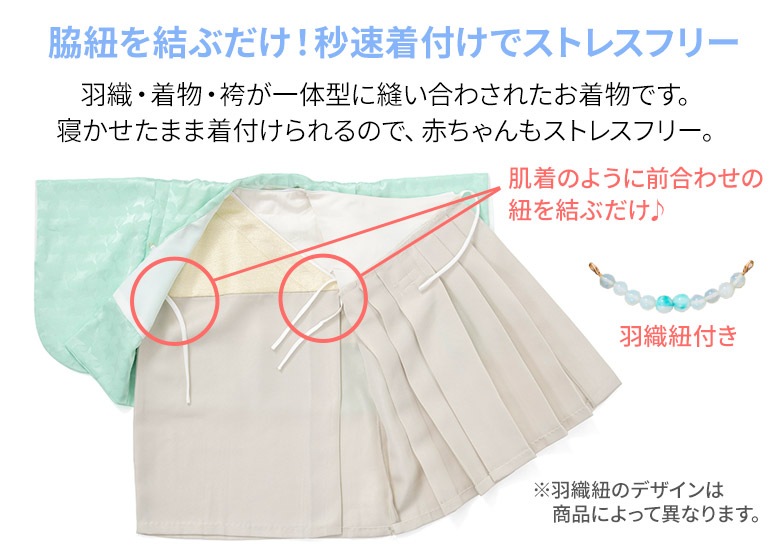 当店オリジナルデザインの羽織・着物・袴はすべてが一体に縫い付けられており、肌着のように脇の紐を結ぶだけの簡単着付♪