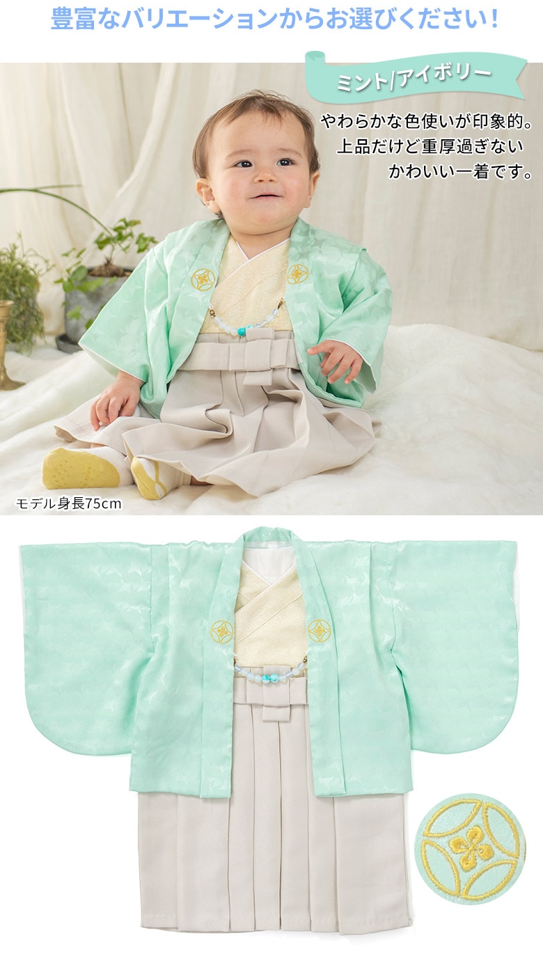 男の子ベビー着物 羽織袴セット 100日-1才 60cm 70cm 一体型 着付けかんたん 初節句 出産祝い 端午の節句 お正月 百日祝い お食い初め 赤ちゃん ベビー和装 ギフト