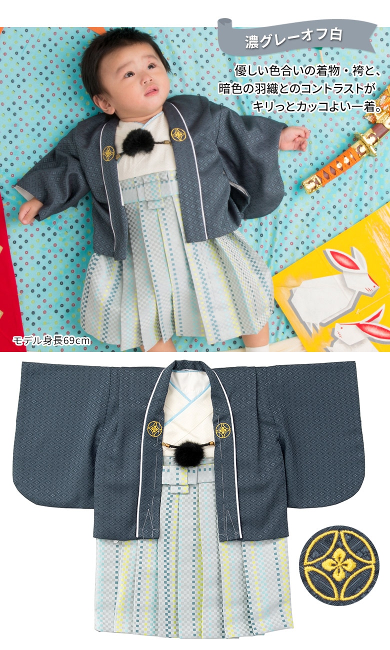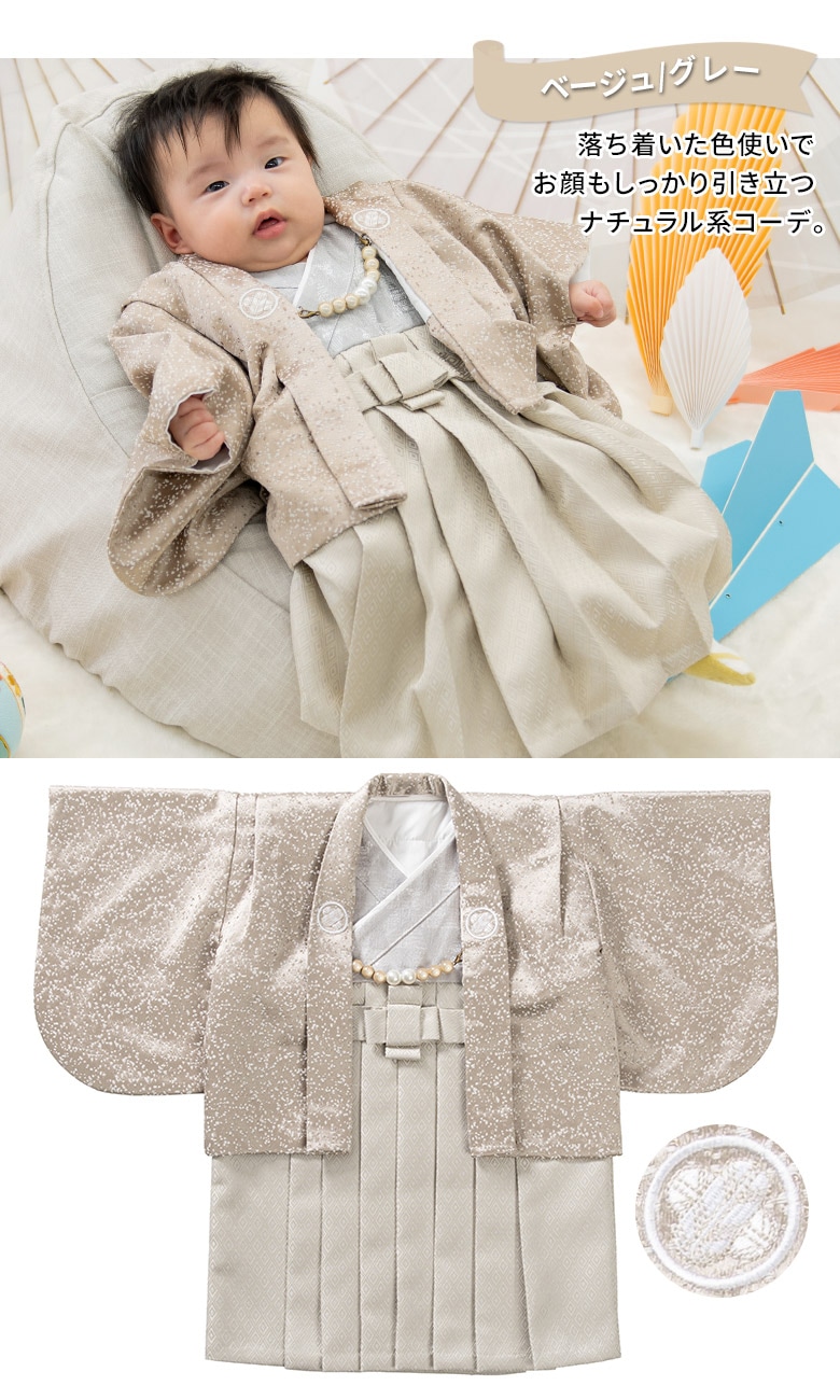トップ > ベビー > ベビー着物 > 男の子ベビー着物 羽織袴セット 100日-1才 60cm 70cm 一体型 着付けかんたん 初節句 出産祝い 端午の節句 お正月 百日祝い お食い初め 赤ちゃん ベビー和装 ギフト