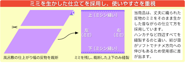 | ご注意 | ・生地幅そのままで仕立てているため、二辺のみ縫製されています。(四辺縫製ではありません。) ・水濡れや洗濯をしたり、強くこすると色落ちする場合があります。 ・長期間包んだままにしておくと色移りする恐れがあります。 ・箱入りではありません。 ・ご覧の環境(モニター設定等)や入荷時期により色みが若干異なります。